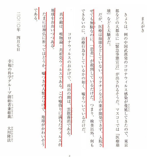 | 3288 Date: 2020-04-13 (Mon) 日本国民は「敵」の味方になっているマスコミを叱るべし [3286]で「嘘をつくなかれ」のまえがきを紹介しました。真の敵は、唯物論・共産党ウイルスである。この嘘偽りに満ちたウィルスが地球をおおいつつある、という一文です。 その、中国共産党が統治する病院では「診療科ごとの実績制度」がとられていて、診療費を滞納している老人は「殺されている」という告白があります。診療代を払えない病人を抱えることは、その診療科の医師や看護士のボーナスが減るという理由からです。 中国共産党の統治する病院では集中治療室で殺人が行なわれている 医師でさえ良心を麻痺させる唯物論・共産党ウィルス 安倍総理自身が「敵」を認識できないで、習近平の国賓招聘を計画したり、WHOテドロスに送金したりしているのですから情けない話ですが、アメリカではCCP(中国共産党)やWHOの責任を追及する動きが激しくなってきています。 なぜ日本はこんなに「正義感」が薄れた社会になってしまったのでしょうか。 原因は、「敵」が仕掛ける「藍・金・黄」工作に嵌っているからだと言えるでしょう。マスコミは「正論」を述べる宗教政党を完全に無視して、政策や警告を報道しません。「正論」は「敵」にとって都合の悪いものだから、報道を規制するように工作を仕掛けられています。また、数多くのかく乱情報も流されています。「コロナはアメリカが持ち込んだ」というような「混ぜっかえし」情報を工作員もネット上に流しています。 「敵」の戦略は“離間策”日米同盟の破棄であり、日本の国内世論をも“離間”させることを狙っています。 日本ほど「藍・金・黄」工作に無警戒な国家はないでしょう。コロナ禍をキッカケに世界は明確に「敵」を認識しつつありますが、日本のマスコミだけは誰が敵で誰が味方か分からずに、「井の中の蛙」のように見当違いの騒ぎを起こしています。 かつては、アメリカが敵だったこともあります。アメリカが「正義」を見失って、日本の力を殺ごうとしたこともあります。しかし今は「味方」です。 昨日はトランプ大統領を指導している霊人のトス神の望む「中国解体の道筋」という霊言を拝聴してきました。