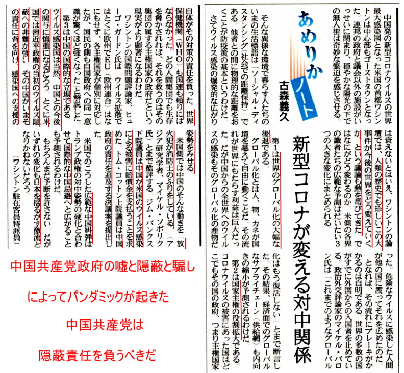 | 3286 Date: 2020-04-11 (Sat) 一部のマスコミはゴミというよりも危険な腐敗物に変質した アメリカの多くのマスコミが中国寄りの偏向報道をしていることは、トランプ大統領が「フェイクニュースだ」と批判して以来、明らかにされてきています。 アメリカで次々と明らかになったリベラルメディアの偏向報道 民主主義を守るのは国民 今日の鳴霞情報でも、アメリカ国営放送の[NHK化]を報告していました。アメリカ政府の報道機関であるはずのVoice of Americaが日本のNHKと同じように中国政府の発表をそのまま報道していることをトランプ大統領は問題視し改革するのでしょう。(注:参照) 一方でスティーブ・バノンのように中国政府の嘘報道を暴く声もあります。バノン氏は「コロナ問題を解決するために」中国に調査団を送ることが先決だとして、北京政府を怒らせないように対応しているだけだが、中国政府は「完全に隠蔽し、調査団の武漢入りを認めない」という真相を語っています。 新型コロナウィルスが中国共産党政権にどのような影響を与えたのか? 中国が武漢への調査を拒否している話は8:20辺りから 水間氏がyoutubeで指摘しています。 『日本は4月だけで3000人以上の中国人を特別入国させていた』 中国の嘘を見抜いて「真実を報道する」報道機関が日本にはNHKを含めて一つも存在しないことは国家として大変危険な状態であると言えます。 中国共産党は「天安門事件」以来、世界中の報道機関に工作員を送って「中国寄り報道」がなされるようにしました。アメリカに民主党政権が続いたら、世界は中国共産党の天下になってしまったでしょう。ソ連が企てたコミンテルン(1919年から1943年まで存在した国際共産主義運動の指導組織、 別名第三インターナショナル、国際共産党)よりも過酷な全体主義国家かもしれません。 トランプ大統領の誕生はリベラルなマスコミの評価とは違って、大変心強いものがあります。理由はトス神が指導しているからです。 トランプ氏のスタッフは従来の共和党とも違ってトランプ党というのがふさわしい組織ですが、幸福実現党の政策はトランプ党の政策に近いものがあります。 釈量子党首は、本日公開の動画でエネルギー自給の大切さを訴えると同時にトランプ大統領と同じ「パリ協定脱退」を訴えています。 今回のコロナ禍によって、国連の組織というものが如何に中国に操作されているかということが学べました。IPCCの地球温暖化対策とは科学ではなく政治運動だと関係者が白状しています。 パリ協定脱退を訴える幸福実現党党首(13:45辺りから) この嘘偽りに満ちたウィルスが地球をおおいつつある。 とあります。
