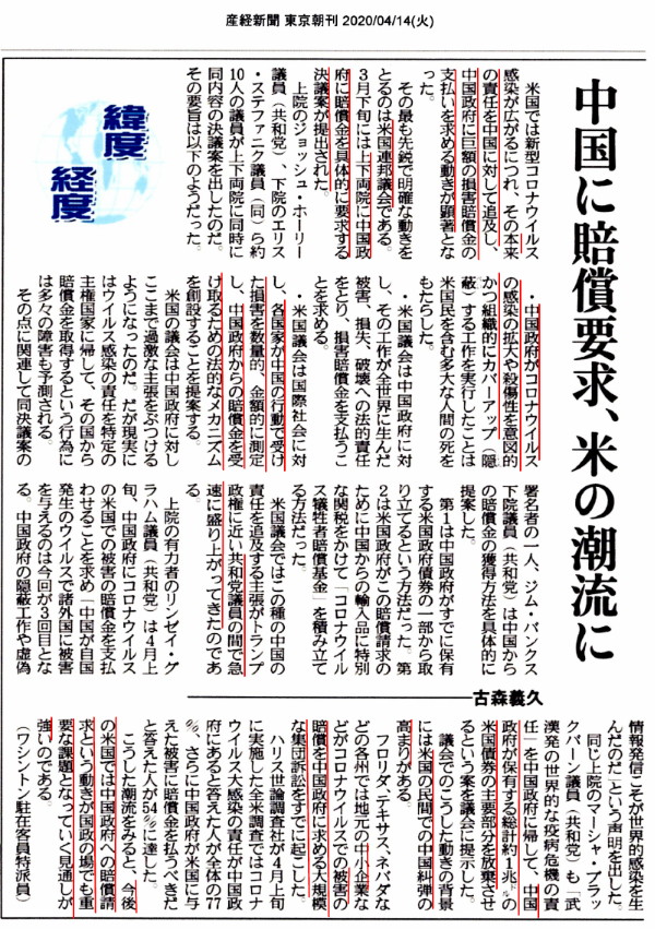 個人的な感想では「電撃一閃悪魔を打ち破って欲しい」という気分です。 標題にあるように「マスゴミ状態」から「危険物状態」に変化してしまいました。 R.A.ゴールは「マスコミをガタガタにする」と言っていました。 注:1 VOAが「中国の宣伝に加担」 米政権、異例の批判 米政府の対外宣伝を担うVOAを政権が批判するのは異例だ。 声明は、VOAが最近の記事で、新型コロナウイルスで都市封鎖が行われた中国・武漢市を「成功例」と伝えたことを紹介。「中国の秘密主義は死のウイルスを世界中にばらまいた。ジャーナリストは事実を知らせるべきなのに、VOAは中国のプロパガンダを増幅させている」と非難した。 米国が中国の死者数を上回ったことを紹介するVOAの記事についても「中国の数字が正確かどうかは検証できない」と指摘。「VOAは、米市民でなく敵国の代弁者となっている」と断じた。 注:2 中国人3千人入国の問題は誤解もあるようです。 なるほど、帰国者がふえたので、東京(成田空港)と、関西(関西空港)から入国しているのか。愛知はセントレアが閉まっているので、新規の感染者が少ないわけだ。 注:3 中国人3千人入国の問題は及川氏が4月15日に、訂正発言を行なっています。3千人の中には帰国日本人は含まれていない、と訂正しています。 [前回動画訂正とお詫び]ニュージーランドのロックダウン ならば、やっぱり大問題じゃないのか。訂正の仕方が甘い感じがするのだが。 |