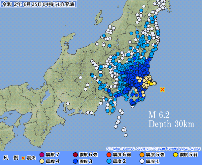 | 3342 Date: 2020-06-25 (Thu) 今朝のM6.2地震が9年前の地震の余震だったと誰が信じるか 今朝5時前に千葉沖でM6.2の地震が発生しました。 千葉の震度5弱 9年前の余震か
