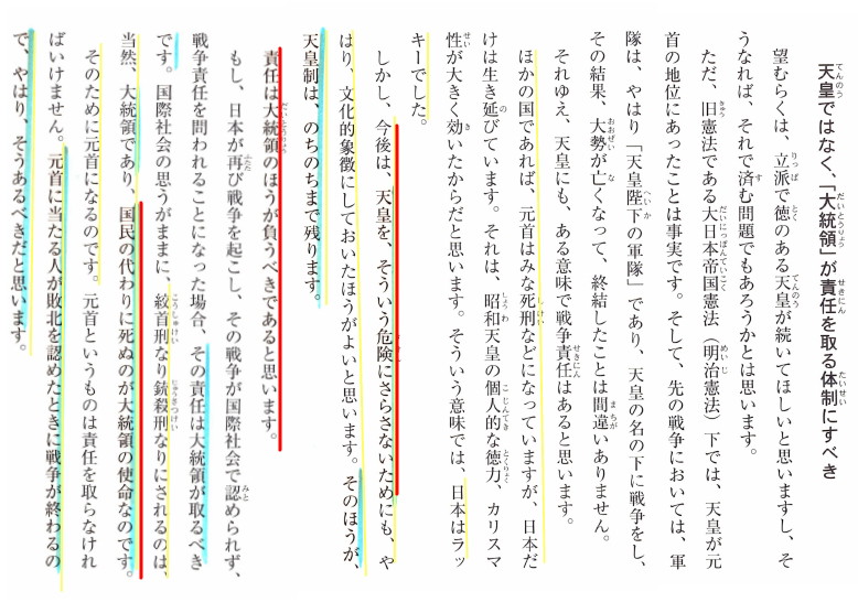 にもかかわらず、元首であるかのような責任を押し付けられるのはお気の毒だと思います。 [2687]に紹介した吉田信啓氏(「富士古文書」「神皇紀」の内容)によれば、大和朝廷の初代より前にも、朝廷は九州と富士山麓と場所を変えて存立していたようです。 世界にも誇れる歴史を持つ天皇制を維持するためにも、そして、民主主義的な政治体制を重要視する近代国家のあり方としても、「大統領」が判断して戦争責任をも負うという形が良いのではないかと、提案しているのが「新・日本国家憲法試案」です。 2009年当時右翼の活動家が来て「天皇制」を14条に述べるのではなく、最初に論ぜよと主張したそうです。しかし、最初に論じて、元首であるかのような扱いにすることは、発言も許されない天皇を窮地に追いやる不敬な扱いなのではないでしょうか。 少なくとも宗教政党が公明党だけというのは近代国家として相応しい事ではないという気がします。 |