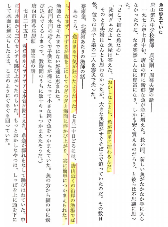 | 3341 Date: 2020-06-23 (Tue) 魚の異変は中国に天変地異が起きる予兆なのか 中国では魚がジャンプする映像が報じられています。地震の前兆ではないのかという声もあるようです。 44年前に起きた唐山大地震(1976)でも、魚が大暴れしていました。「唐山大地震」の中の記述を紹介します。 ![]() 銭綱著「唐山大地震」p.22より 中国のとんでもない暴政に対して天帝(地球の主治医)が外科手術を決意したのかもしれません。 |