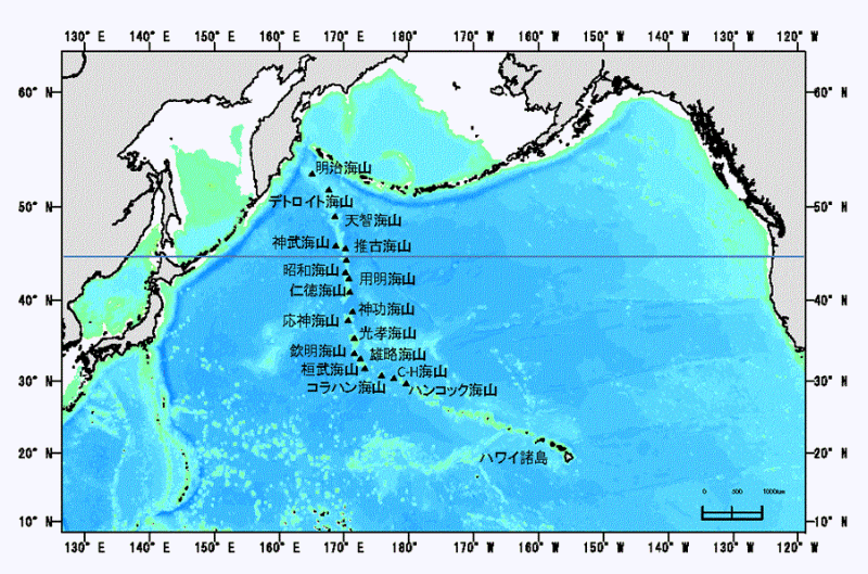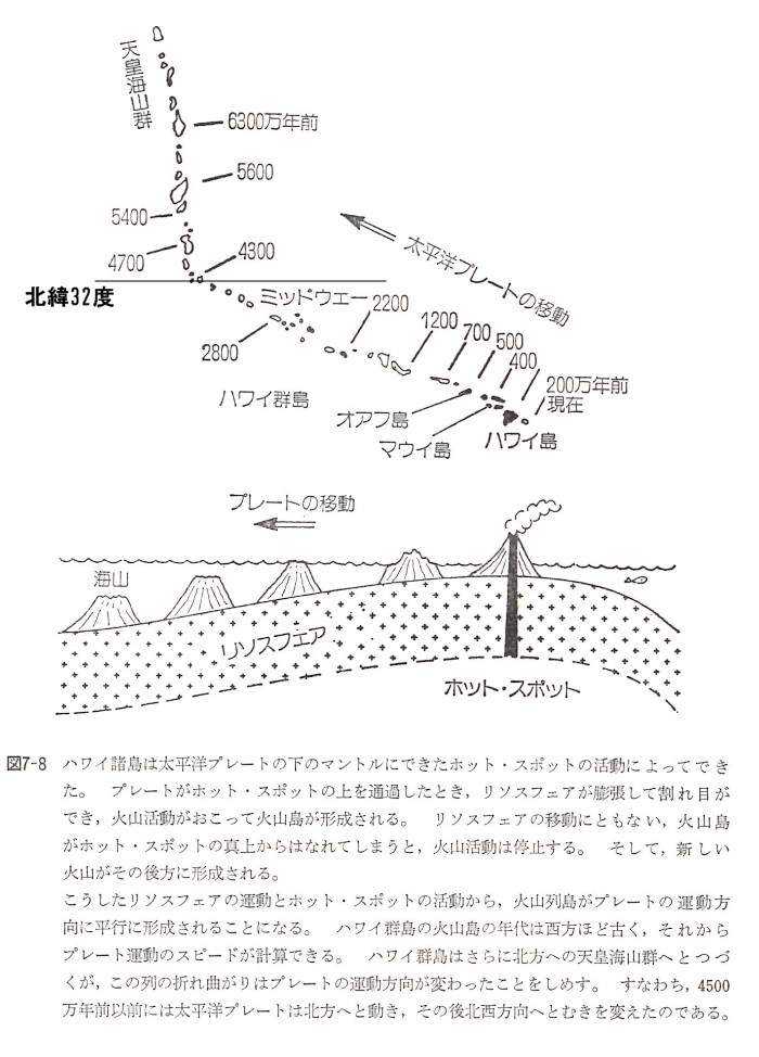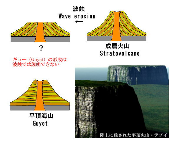 | 3387 Date: 2020-08-15 (Sat) プレート論は体系的廃棄の時期に来ている(Guyot 形成論の矛盾) ギョーについてはすでに何度も解説([1806]、[1807]、[1813]〜、[2436]など)してきましたが、ギョーの形成過程を現代の地球物理学ではプレートの運動で説明しています。 次図にあるように、海嶺付近またはホットスポット上で誕生した火山が、波浪によって頂部が“波蝕”され、さらにプレートが移動することによって深海底に移動した、という説明になっています。Andel著「さまよえる大陸と海の系譜」に載っている図面を紹介します。 ![]() Andel著『さまよえる大陸と海の系譜』p.121より この解釈が間違っていることを、海山の頂部水深から証明してみます。 天皇海山はディーツが命名したものですが、日本の研究が進んでいたことを来日して知ったディーツが敬意を表して日本の天皇の名前をつけたのでしょう。 ![]() ![]() この図はプレート論がデタラメであることを証明している しかし、プレート論者の言うような理屈でギョーが形成されるのなら、頂部水深は一定の右上がり傾斜勾配上に配置されるはずです。 結果はバラバラで、プレート論者の解釈は破綻しています。 ギョーは水平勾配の成層火山であることが分かっていますが、波蝕で水平な成層形状になるわけがありません。([2732]、[2449]など参照) ![]() Heazenn Guyotの音波探査断面