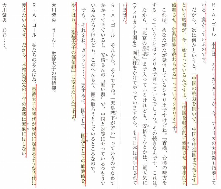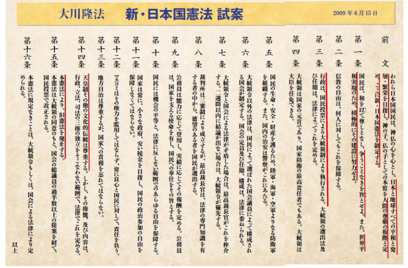 | 3372 Date: 2020-07-30 (Thu) 聖徳太子の価値観から見たら、明治維新の近代化は中途半端だった 日本のマスコミ報道を見ていても分からないことですが、世界はこの一年でまったく違う景色になってしまい、劇変しています。政治の世界でも「斉一論」が否定されているかのようです。 世界は中国包囲網で固まり、日本だけが蚊帳の外に置いてきぼりのような状況です。しかし、本当の指揮者は誰であるのか、数年後には分かってくるでしょう。 宇宙存在者R・Aゴールのコメントを読んでから次の動画を見ると、世界と日本の流れがよく理解できます。 ![]() 『コロナウイルス 人類への教訓は何か』p.107 p.123 より 霊人聖徳太子の発案(霊筆)による「新日本国憲法試案」では「大統領制」を薦めていますが、自民党の憲法改正案は一条で「天皇は元首である」と規定しています。 これは将来不幸にして敵国が現れて敗戦となったときには「天皇を絞首刑にされてもかまわない」というまったく不敬な考え方なのですが、自民党の政治家には分からないようです。 天皇陛下にとってはお気の毒な政治家群しかいません。 死をも覚悟しなければならない過酷な仕事を天皇に押し付けないで、選挙によって選出された、しかも任期のある大統領が全責任を持つ姿のほうが、天皇家は永い期間継続できます。 こんな明瞭な理屈が分からない保守政党にはもう退場してもらうしかありませんね。 新・日本国憲法試案を読めば、天皇を大切に扱う思想が入っていることが分かるはずです。 追記: 先ほど、台湾の李登輝氏が97歳で逝去されたと報道されました。日本には薄れた『日本精神』を残してくれた功績は大きいと思います。きっと、救世主のもとに報告にこられると思います。霊言が収録されるのではないでしょうか。 参考: (現行憲法) 明治期の憲法「大日本帝国憲法」では、第4条で天皇は元首であると規定しています。昭和天皇はこの憲法の下で、絞首刑にされる可能性があったのです。自由民主党の政治家達はまたこの危険性を犯すことに気付いていないのでしょうか。無責任と言うべきです。 |