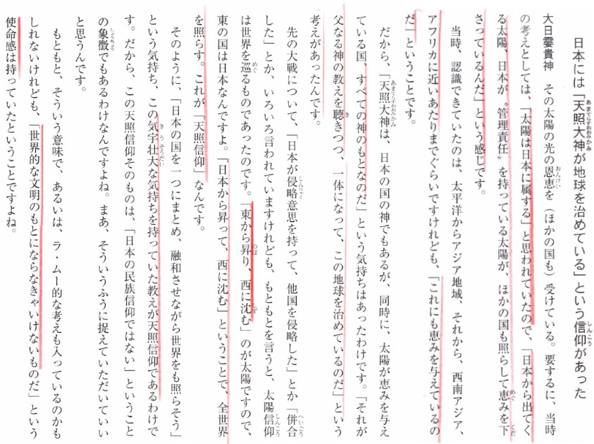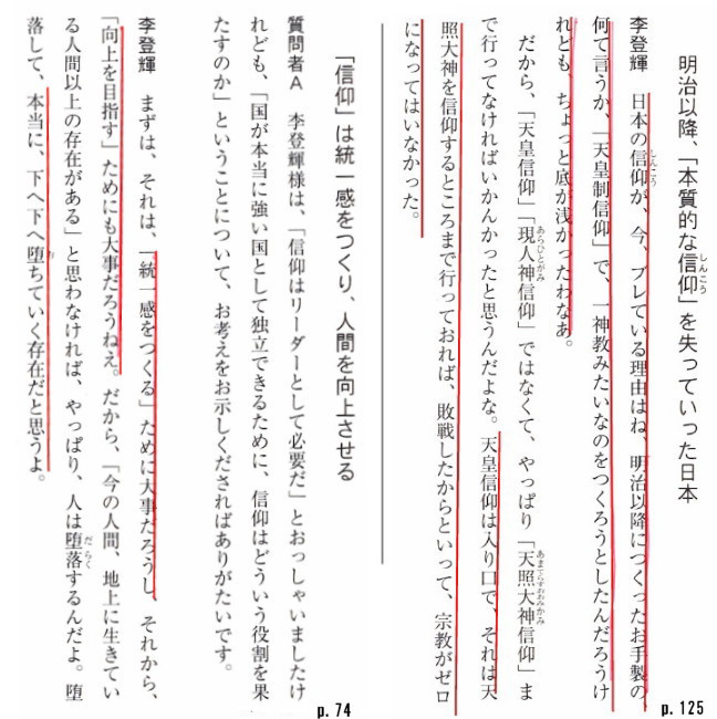 「明治以降に作ったお手製の「天皇信仰」が底の浅いものだった」 と述べています。天皇を元首にして「現人神」と考える“一神教もどき信仰”が日本古来の“天照信仰”から外れたものだということです。 現在、頭の悪い自民党政権は、憲法改正案に明治憲法と同じ「天皇元首」を取り入れようとしています。 日本の教育に感謝し、武士道精神を高く評価する李登輝氏でも信仰に関しては世界性のあるキリスト教徒として「内心の安定」を図って来られました。 [3372]でもコメントしましたが、明治維新を断行した下級武士たちが上位にある旧体制派を完全に排除することがはばかられたことから、中途半端な「近代化」に終わったことが原因だろうと思われます。 天照信仰から、もっと遡ったラ・ムー信仰にまで「気宇壮大」になれたら、李登輝氏の信仰も変わっていたのだろうと推定できます。 現に霊人李登輝氏は「信仰の効果」について「統一感をつくるために大事」という視点と「(国民の)向上心のために大事」という視点を持たれています。