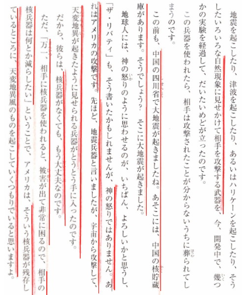 それほど重要な場所なので封鎖したのでしょうが、コロナウイルスが自分たちが作った細菌兵器であることが分かっているからなのでしょう。 アメリカは中共軍部がコロナ菌を目的を持って撒いたことを把握しているから、激怒していることがよく分かります。徹底的に中共の組織を破壊することでしょう。 中国政府は戦争の準備をしているのでしょうが、武器が時代遅れなのではないしょうか。 なお、2010年2月26日の霊人マヌの霊言では「四川省の地震は人工地震である」と述べていました。 ![]() 『レムリアの真実』p.147-148より |