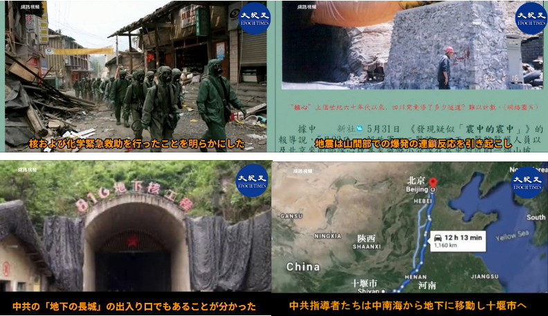 | 3374 Date: 2020-08-01 (Sat) 中共が嘘をつき続けるのなら戦争は避けられないだろう [1423]、[1450]などで12年前に起きた四川大地震の報道を紹介しました。当時白衣の救助隊の写真は載っていましたが、「核および化学部門」の黒衣の救助隊は報道されていませんでした。山の頂上からコンクリート片が噴出するのを目撃した人の話なども紹介されていました。 今回エポックタイムは、アメリカの成都領事館が閉鎖になったのは、一帯の中国内陸部での軍事行動や、地下に存在する「地下の長城」とも言われる地下核工場を秘密にしたいからであろうと報じています。 中国共産党第二司令部の秘密 四川汶川地震で報道されています。