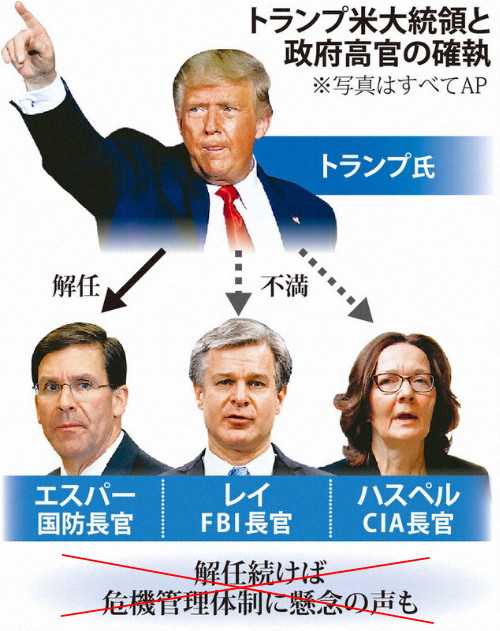 | 3438 Date: 2020-11-12 (Thu) トランプ政権第2期目、FBIとCIAの人事急げ ポンペオ国務長官は「政権引継はスムーズにやる、ただしそれはトランプ政権の2期目である」と答えたそうですが、トランプ勝利を確信しているようです。 「トランプ政権2期目に」 ポンペオ国務長官、忠誠示す また、バイデンが獲得した選挙人数はすでに259に戻され、270を超えていません。 一方で、Forbes JAPANは、トランプ氏が敗戦を認めず「粛清」を始めたというピンボケ報道を発信しています。 ーーーーーーーーーーーーーーーーーーーーーーーーーーーーーーーーーーーーーーーーーーーーーー 選挙での敗北を認めないトランプ、政府高官の「粛清」を開始か Forbes JAPAN 「シートベルトを締めておけ。この先数カ月間、道のりはなだらかではないかもしれない」──米紙ワシントン・ポストのコラムニスト、ジョシュ・ロギンは11月7日、「トランプの“粛清”が始まった」と明言した。 以前から広く予想されていたとおり、ドナルド・トランプ米大統領への忠誠心が足りないとみなされた政府高官らの粛清が進められているもようだ。大統領選が行われた11月3日以降、少なくとも9人が自ら、または意に反して、職を離れている。 複数の米メディアが報じたところによれば、直近の“犠牲者”は、国防相のジェン・スチュワート首席補佐官だ。10日に解任され、その後任に選ばれたのは、デビン・ニューネス元下院議員(ロシア問題を巡る調査の信頼性を損なおうとする共和党の試みを、下院情報特別委員会の委員長として支援したとされる)のスタッフ、カシュ・パテル。 Foxニュースによると、同日には海軍特殊部隊(SEALs)出身のジョセフ・カーナン国防次官も辞表を提出。今年2月から次官代理(政策担当)を務めてきたジェームズ・アンダーソン国防副次官(政策担当)も同日、ホワイトハウスが国防総省にトランプの支持者を複数送り込もうとしていることに反対し、自ら辞任を申し出た。 これらが起きた前日には、トランプがマーク・エスパー国防長官を解任すると発表している。エスパーは、ホワイトハウスの指示に従順だってきたことで「イエスパー」と冷笑されてきた人物だ。 ただ、エスパーは6月に起きたジョージ・フロイド殺害事件をきっかけに広がった反人種差別デモを鎮圧するため、トランプが連邦軍を動員しようとしたことに反発。そのほか、南北戦争の将官の名を冠した米軍基地の名称変更を推進したことでトランプを怒らせていた。 一方、司法省でも9日、およそ10年にわたって選挙犯罪の捜査を主導してきたリチャード・ピルガーが、ウィリアム・バー長官が「多数の不正」を巡る捜査の開始を承認したことに抗議し、辞任している。 トランプに近い筋は複数の解任を予告 そのほかトランプ政権は、国家核安全保障局のリサ・ゴードン・ハガティ局長、米国際開発庁のボニー・グリック副長官、連邦エネルギー規制委員会のニール・チャタジー委員長を解任した。 核兵器と電気・天然ガス、海外援助を管轄する3つの連邦政府機関のトップを退けたことになるが、このうちチャタジーは、自身の解任は“おそらく”、気候変動対策としてカーボンプライシングの導入を推進してきたことに対する報復だろうと述べている。 さらに6日には、政府の「米地球変動調査プログラム」を率いてきた科学者、マイケル・クーパーバーグが解任された。米紙ニューヨーク・タイムズによれば、後任には気候変動に懐疑的な見方をしている人物が据えられる見通しだという。 トランプに近い匿名の情報筋がメディアに対して明らかにしているところによると、「大統領をいら立たせてきた数多くの高官が、近く解任される可能性がある」。 ニューヨーク・タイムズが「公衆衛生当局の関係者が標的にされるだろう」と報じているほか、CNNは「中央情報局(CIA)のジーナ・ハスペル長官、連邦捜査局(FBI)のクリストファー・レイ長官にトランプの怒りが向けられており、真っ先に更迭される可能性が高い」と伝えている。 ーーーーーーーーーーーーーーーーーーーーーーーーーーーーーーーーーーーーーーーーーーーーーー トランプ大統領の一期目はDSの構図が分からないまま、周囲の推薦などで人事を決めたのでしょう。今回の選挙で構図が読めてきたのなら、それに沿った人事が当然おこなわれるべきです。 FBIのレイ長官は郭文貴やバノン氏とは利益相反する側に行いた人ですから、トランプ大統領の目指す政治と反対側にある人に影響を受けているはずです。 トランプ氏は「闇がこんなに深いとは知らなかった」とも述べていますが、DSは根が深いですから、混乱した選挙は「闇の色分け」をするには善かったのではないでしょうか。 大統領の2期目には本格的に中国共産党を壊滅する仕事が待っているのですから、人事にミスが無いように、万全の態勢を立ててもらいたいものです。 シドニー・パウエル氏やマイケル・フリンのような信念の固い人をFBIやCIA