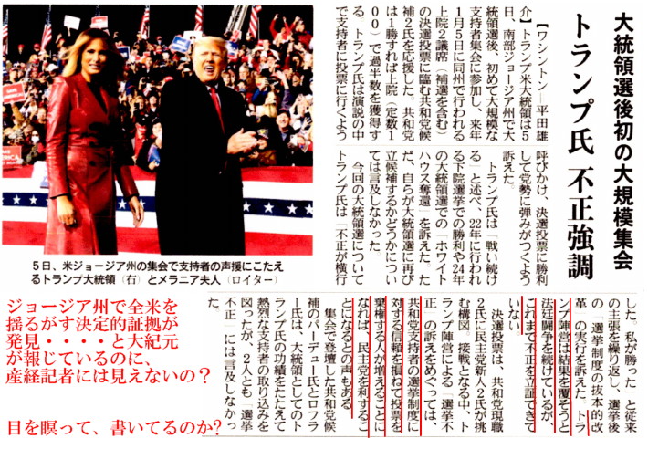 | 3463 Date: 2020-12-07 (Mon) 反乱法、戒厳令を意識しているトランプ大統領 ジョージア州で全米揺るがす決定的証拠が発見というニュースがネット上では飛び交っているのに、産経新聞でさえ、「不正を立証できていない」と書いています。 (こちらにも報じられています。ジョージア州集計所の監視カメラ 大量の隠し票) ![]() 産経新聞2020年12月7日東京朝刊 そんなことより重要なのはマクナニー将軍が言ってい 大統領の「これまでで一番重要な演説」というのは、国家が不正選挙によって乗っ取られようとしている、これは外国からの攻撃である、だから開戦を意識せよということでしょう。国民が立ち上がって、不正を排除する機運を作れなければ、「限定的戒厳令」を発布するしかない、そこまで行かないうちに国民よ目覚めよ、というメッセージなんだと思います。 日本国民もよく理解しておかなければなりません。 産経よりも闇のクマさん情報に価値があるというのは皮肉なことです。 ジョージア州の共和党大会で「決して絶対に降伏しない」と咆哮しています。 |