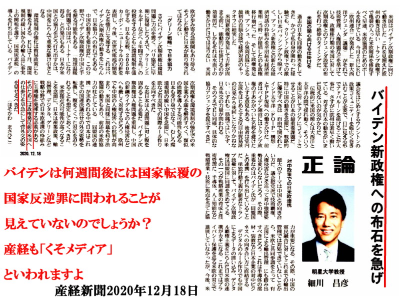 | 3470 Date: 2020-12-18 (Fri) 不滅の正義は敗れない、Trump二期目は必ずある 我那覇真子さんがホワイトハウス近くに集まっている群衆の中から、素晴らしいインタビューを取ってくれています。プロであるはずのメディアは何をやっているのか、ディアナさんは「クソメディアはもう見ない」と言っていました。 「私たちを引き摺り下ろすためにね、賢い人は分かっている、馬鹿な人たちはわかっていない、やつら(Antifa)は馬鹿よ」 「トランプはレーガン以来最高の大統領です。30年間忍耐してきたわ、ブッシュからバイデンまでのグローバリスト、悪の人たちによって、こうなってしまったの。2020年は計画されていた」 「メディアがガンね、世界中のメディアがガンね、本当にそう、恥ずべきだわ、悲しい。戦い続けてください。たとえば、クソメディアはもう見ない。本当に国が無くなってしまう、日本も戦い続けましょう」 「たくさんのソルジャーが必要です。自分の国を信じ、神を信じ、家族を守り、国旗を守り、国を守るのです」 政治に無関心だったというディアナさんのような一市民が目覚めた感じです。日本はまだ眠っています。 決してトランプを敗退させてはいけません。それは国家乗っ取りを許すことであり、やがて日本も乗っ取られることを意味します。 産経のオピニオンに細川氏が「バイデン政権に備えよ」なんて書いていますが、やがて「クソメディア」の一つに数えられるでしょう。