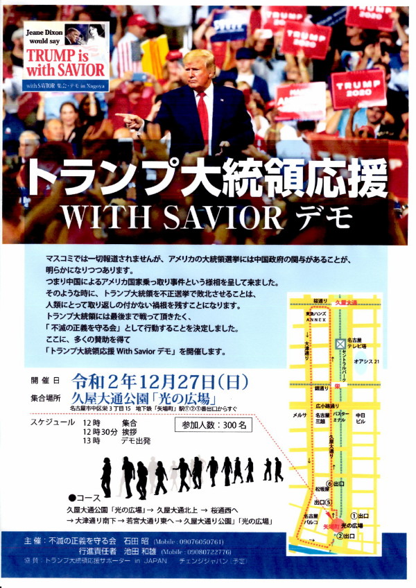 | 3468 Date: 2020-12-12 (Sat) トランプ再選の道はまだある テキサス州の訴えを連邦最高裁は「訴える資格なし」という理由で却下しましたが、まだ終わったわけではない、と及川氏が詳細に解説しています。 14日の投票結果は直ぐには公表されず、23日にペンス副大統領に封印されて提出されるだけだそうです。1月6日に副大統領が開封するのですが、それまでに「目覚めた世論の空気」によっては副大統は「拒否」する選択肢もあるということです。 トランプ大統領が任命した3名が却下する側に立ったのは意外でしたが、何か意味があることなんでしょう。 路徳社は及川氏とは別の興味深い解説をしています。 --------------------------------------------------- 2.最高裁判所の裏にある意味を読み取れば、トランプ大統領の再選への疑いがなくなる ◆テキサス州の訴訟を連邦最高裁が受け入れることに同意すれば、民主党各州も逆に共和党各州を訴えることができてしまう、そうすると、現在主導権を握っているトランプ大統領の法廷での戦いが混乱し、短期間での決着がしづらくなるだけでなく、逆にトランプ陣営の戦術を乱すこととなる。 ◆トランプ陣営の戦術は、1月6日辺りで相手を仕留める大技を放ち、相手に反撃する時間を与えないようにすることである。もし事前に大技を放つと、相手に反撃する時間を与え、自分が受け身状態に陥り、簡単に破られてしまうような状況に追い込まれる。 ◆トランプ大統領が指名した3人の判事はいずれも共和党の州の訴訟を否決したことで、民主党や中道政党の有権者にその公平性を大きく高めた、その後の判決の世論に対して確固たる基盤を築いた。 ◆アラスカを含む20州近くが支援に加わったテキサス州の訴訟は、大きな波紋を呼び、さらに多くの民衆の目を覚ます。強い世論は最高裁の最終判断を左右する。 --------------------------------------------------- 1月6日辺りで相手を仕留める大技というのが何かは分かりませんが、電光石火軍事法廷でバイデン逮捕・・・なんて事が起きるのかもしれません。 また、ペンス副大統領が「拒絶」する空気を作るためにも、自由主義国家の中で「トランプ応援デモ」が頻発することが重要だと思っています。 12月27日名古屋久屋公園「光の広場」での集会とデモのチラシ(もっといいのを作る予定ですが)の素案を張っておきます。 今回の大統領選挙は単なる政権選択の問題ではなく、世界が共産主義中共の軍門に下るかどうかの「正邪」を分かつ戦いです。 今動かなければ、4年後に公明正大な選挙など期待できません。 「不滅の正義を守る会」主催の上記チラシを各所に配ってデモ参加者を募っています。 300名を予定していますが、人数は16日に警察へ申請します。 23日開催の東京デモは先着100名という案内でした。名古屋もそうするかも知れませんが・・・未定です。 |