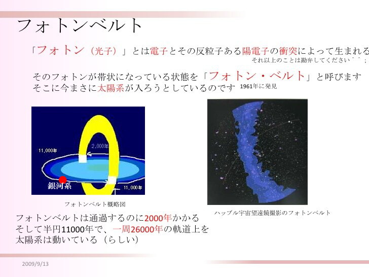 地上生活の意味を伝えるのが宗教の役割ですが、現代社会では伝える手法が科学的に進化しているにもかかわらず、伝達機器の所有者、つまりメディアが伝達を妨害しています。 【POINT】 地球神が伝える価値観が広まらないとき、様々な天変地異が「気付き」を求めて発生する、ということが繰り返されてきました。それが、忘れ去られた文明も含めた地球文明の発生・消滅という人類史です。 文明は1万数千年ごとに興亡を繰り返していますが、驕慢化した科学精神が興亡の理屈の理解を拒絶しています。 まずは、エドガー・ケーシーの霊言を紹介します。 ![]() エドガー・ケーシーの未来リーディングp76より フォトン・ベルトとはドーナッツ形状をした宇宙に漂うフォトンの帯です。このなかを銀河系は2万6千年かかって一周しますので、その間に二回はベルトを通過することになります。 ![]() 「読書するエンジニアの会」庄司隆太郎氏より ここから先は「地震爆発論」が説明する地震の発生原因説で解説できます。 爆発が鉛直方向(押し円錐軸が鉛直)ならば、大陸を浮上させる原因になりますし、爆発が水平ならば、大陸が沈降する原因になります。 30年近い昔のことですが、高徳なる人から「地球上の闇が広がる」現象と「大地震が頻発緯する」現象と、どこに接点があるのだろうと聞かれたことがあります。 私の回答は、 「闇が広がる」現象を地球意識は辟易として受け取り、「頑張って人類の修行の場を守ってやろう」という意識が薄れるのではないか、その気力が萎えるときに「地殻の疲労破壊」が起きて、地殻に亀裂が生じ、海水や地下水の落下による熱離現象がはげしくなり、大陸の沈没のような天変地異につながるように思う、という説明でした。 高徳者は「なるほどね」と頷いておられました。 30年たって、地球神の喜びにつながるような「価値観の伝達」が遅々としている状態に慚愧の思いにかられますが、少しでも天変地異が小規模に収まるように、その間に人類の「気付き」が進展するように、残りの人生を掛けなければならないと、思っています。 |