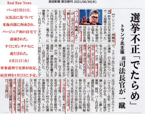 | 3516 Date: 2021-06-30 (Wed) クラゲ(骨なし)のような支局長は心配だが、産経紙には立派な言論人がいる Real Raw Newsがヒラリーの処刑を伝えた直後、クリントン夫妻がニューヨークのレストランで食事をする風景をメディアは伝えました。その時のヒラリーは明らかにバイデン就任式に現れた偽物のヒラリーでした。 同じようなことを中共もやっています。董経緯の亡命が報じられた後で董氏の会議出席を報じて、情報をひっくり返し混乱させました。 今日の産経新聞ではウイリアム・バー元司法長官の「反トランプ姿勢」を報じています。(軍事裁判でのバー元長官の有罪決定直後です) 取材姿勢に疑問府が付く黒瀬悦成ワシントン支局長の記事です。