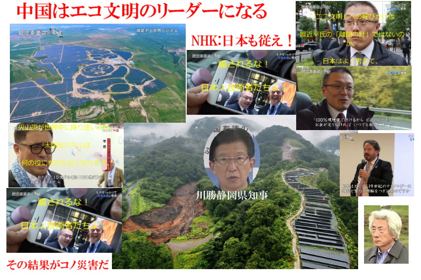 | 3522 Date: 2021-07-05 (Mon) 熱海の災害は親中知事の愚弄な政策による人災だ! 熱海伊豆山の土砂災害は人的被害が増大する模様です。 毎日新聞では 「熱海市は、別荘利用者も多いため、居住実態が把握しにくく、安否確認に時間がかかっている。静岡県も土石流の安否不明者をこれまで「約20人」と発表していたが、5日の記者会見で住民基本台帳を基に生存確認できた人を除く計113人の所在を確認中とした。」 と報じています。 住宅地の奥にある山林を伐採してメガソーラーパネルを設置するとは、「再選された親中知事」の発案のようですが、「稲村の火」で知られる紀州の庄屋とは真逆な姿勢を感じます。 村民を守った庄屋と、村民を殺してしまった知事の違いです。 川勝知事は親中政治家(私がお会いした時は早稲田大学の教授でしたが)として知られ、毛沢東の信奉者だそうです。 NHKが制作放映した「脱炭素革命の衝撃」に登場する習近平の「エコ文明のリーダー像」にも心酔しておられたのでしょうが、中国産の「太陽光パネル」を輸入して熱海伊豆山の中腹に設置したようです。 工事で発生する残土を近くの沢の上部に盛り土処理したようです。住民にも知らせず、コソコソと”開発”したのでしょうが、発覚して今後大問題になるでしょう。 その太陽光パネルはウイグルの強制収容所で強制労働によって安価に製造されたものだと報道されています。 ーーーーーーーーーーーーーーーーーーーーーーーーーーーーーーーーーーーーーーーー 熱海土砂崩れの因果関係が問われているメガソーラー/日本のメガソーラーパネルの約8割が中国(主にウイグル)製/価格の安さは強制労働等で成り立っている 日本のメガソーラーパネルの8割は中国製(特にウイグル) 今回の措置で影響が大きいのは、むしろ日本など、中国製の太陽光パネルを大規模に輸入している国である。 ![]() 図ー2 日本の太陽光発電パネルはいまや8割が海外生産になっている(太陽光発電協会)。この中には中国製品が多く入っているだろう。(agoraより引用:杉山 大志氏(キヤノングローバル戦略研究所研究主幹)) ーーーーーーーーーーーーーーーーーーーーーーーーーーーーーーーーーーーーーーーー 習近平による「脱炭素革命」なるものが、単なるプロパガンダにすぎないものであることが政治家諸氏には見抜けなくて、100名近い人的損失(予測)を引き起こしてしまいました。 ![]() 小泉純一郎氏が環境大臣の息子の支援のつもりで「自然エルギー」を謳っているときに、皮肉にも伊豆山で大災害が起きていました。(災害の発生を知っていた?) 災害発生を知った上で「パネルの応援」をしていたらしいです。 マスコミはメガソーラー設置工事との関連を何も報じません。静岡新聞の報道を紹介します。 ーーーーーーーーーーーーーーーーーーーーーーーーーーーーーー 崩壊5万立方メートル 盛り土、被害拡大の可能性 熱海・土石流 熱海市伊豆山で発生した大規模な土石流について、静岡県は4日、土石流の起点となった逢初川の上部で、開発行為に伴う盛り土の崩落が確認されたと明らかにした。崩れた盛り土は約5万立方メートルと推定され、周辺を含めると約10万立方メートルの土砂が流れ下ったとみている。盛り土の存在が土石流の被害拡大につながった可能性もあるとみて今後、開発行為の経緯を含めた原因の調査を進める方針。 盛り土が確認されたのは逢初川河口から約2キロの標高390メートル地点。逢初川の起点より約400メートル西側で、盛り土前に谷になっていた地形の最奥に当たる。県が昨年取得した地形の電子データと2010年頃の国土交通省のデータを比較したところ、長さ約200メートル、幅約60メートルの盛り土が分かった。 県によると、土石流の最初の起点が盛り土だったのか、盛り土より下流側の崩落が盛り土の崩落を誘発したのかは現時点で分かっていない。崩れた盛り土の上部には車両が通行できる道が整備されていたが、開発行為の目的や時期も明らかになっていない。 県土採取等規制条例は面積千平方メートル以上、体積2千立方メートル以上の土地改変を行う場合、県に届け出をするように定めている。ただ、全国一律で盛り土を規制する法律はないため県内の自治体が国に整備を要請していた。 ーーーーーーーーーーーーーーーーーーーーーーーーーーーーーー なぜ盛土が必要だったのか、何処から持ってきた土なのか、分かっているのに発表しない知事、報道しないマスコミ、日本の劣化現象は極限に来ているのではないでしょうか。