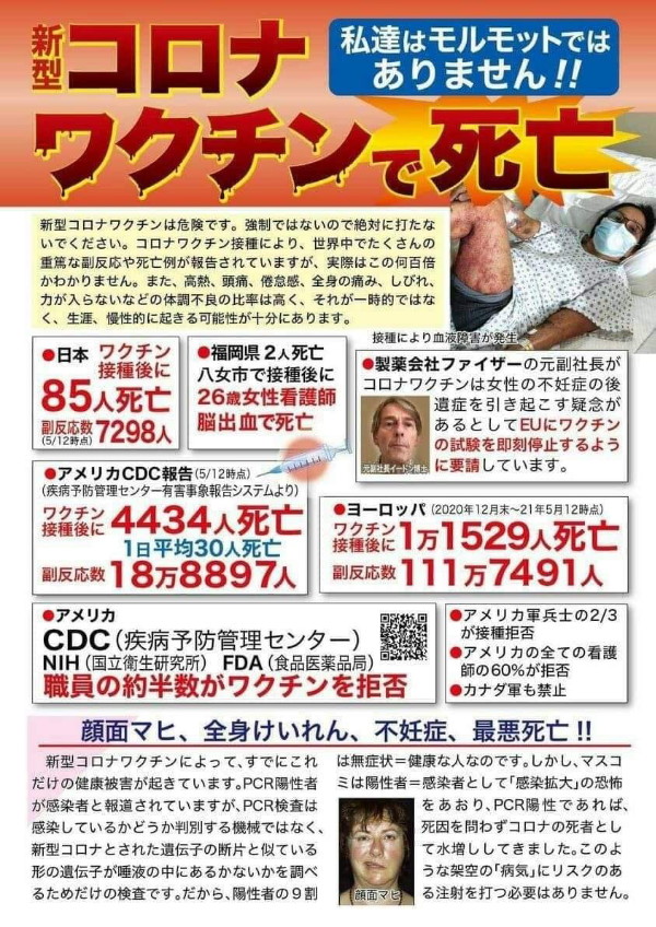 | 3514 Date: 2021-06-25 (Fri) 高橋徳医師らがワクチン接種中止を求める嘆願書提出 今回のコロナワクチンは遺伝子法によるもので、従来の鶏卵法で作るのではない、よって、DNAを壊してしまうから、危険であるという高橋徳医師の講演動画を紹介します。(32:00辺りから参照) 高橋徳医師の貴重なお話 PCRと新型コロナワクチンについて拡散希望 この動画を知っていたことも、私がワクチン接種をしない一つの理由です。 この高橋医師らが「ワクチン接種反対」を訴えて嘆願書を提出しました。 ![]() Youtubeの動画がBanされていますので、写真に差し替えました。 安全性もまだ分かっていない遺伝子ワクチンを国民全員に接種させる必要があるのか疑問だ」 |