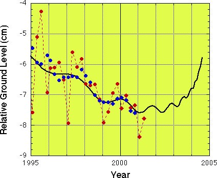 御前崎の実測データから2004年のクリティカルポイントを誘導するのはどう考えても無理があるように思います。 セミナー[288]には予測がはずれたらどうするのでしょうか、とコメントを書いておりますが、どうやら外れるのではないでしょうか。地震関係者の間でも五十嵐予測は破綻したと言うコメントがあり、また日経新聞の記事にあるような「遅くとも二〇〇五年までに起きるという見方が専門家の間で有力になってきた。」というのも事実とは違っているようです。 |