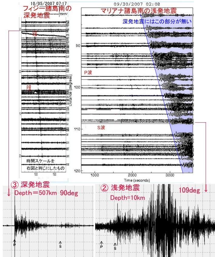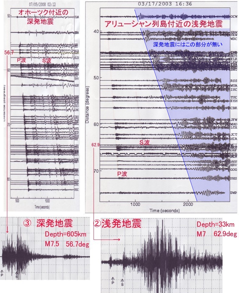 | @との違いも明白ですが、問題は、AとBの波に大きな違いがあることです。下の図は二つの海域で生じた浅発地震と深発地震との違いを比較するために、並べて表示したものです。上段はアメリカ国内での各観測点の波形を震央からの距離に応じて並べたものです。最大振幅で規格化されています。この図から以下のようなことが分かります
