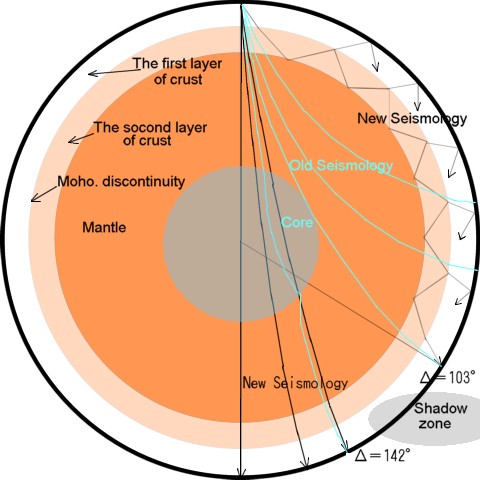 | Fig.1の青い線は地震波が地球の内部を伝播していくと仮定して計算する時の地震波の経路図です。中心角度が103度を越えた地点では地震波が観測されないものですから、そこから先には”伝わらないように”中心核(外核)を想定して、核の内部は液体であると説明しています。しかし、142度を超えるとまた観測されますので、液体の核を通過した波が、さらに到達するように種々”工夫”して考えられています。現在はこれよりももっと複雑に、外核の内部にもう一つ内核をもうけて、そこは固体であると説明しています。