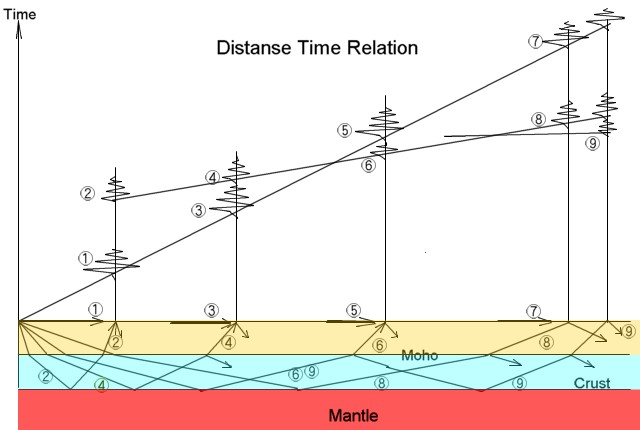 | Fig.2 モホロビッチが考えた地震波の経路と新地震理論による地震波経路 | |||||||||||||||||||