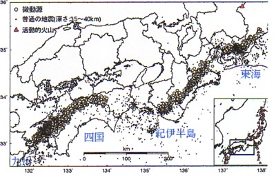 | この図面は地下30km付近で観測されると言う、微小地震の震源をあらわしたものです。人体には感じられない極微弱な震動ですが、液体震動に関連して起こっていることが予想されているものです。四国、紀伊半島、東海と言う火山が存在しない地域に観測される微弱震動は、地下内部に細長い200km程度のマグマプールが形成されていると考えられるのではないでしょうか。