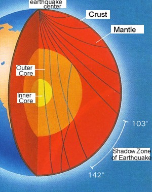| Fig.3 What is believed the course of an earthquake wave to progress on the inside of the earth . Actual course doesn't seem to be this figure. It is right to progress on the inside of the crust. | ||||||||||||||||