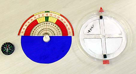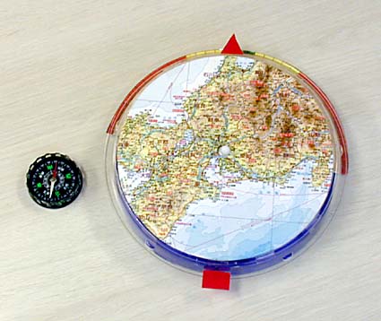 | 一見コンパスには見えないのですが、実に軽々と器用に動きます。その秘密は地図を貼っている蓋にあります。答えは下に。 | ||||||||