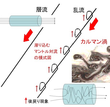 右の図に示すように、乱流(turbulent flow)では層流(laminar flow)と違って、渦(カルマン渦など)を巻きながら進行しますので。全体としては潜っていても、局所的には戻る部分が生じます。”潜りすぎて戻る”という流れを想定すると、解離能力以上に解離した流体部分が下から戻ってくると考えることで、納得できるかと思います。 ニューオフィス26の補遺も参考にしてください。 |
