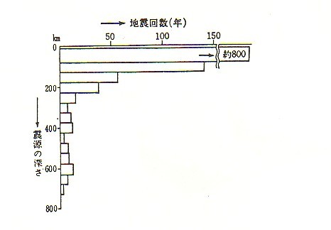 | 図ー3震源の震度分布殆どの地震は100qより浅いところ(新説地震論で定義する地殻内部)で起こる。深発地震は(100qから700qの間で起こる)対流マントルの中で解離と結合の反応を繰り返しているものと考えられます。ただし、地震の規模は小さく、被害を起こすようなものではありません。 |