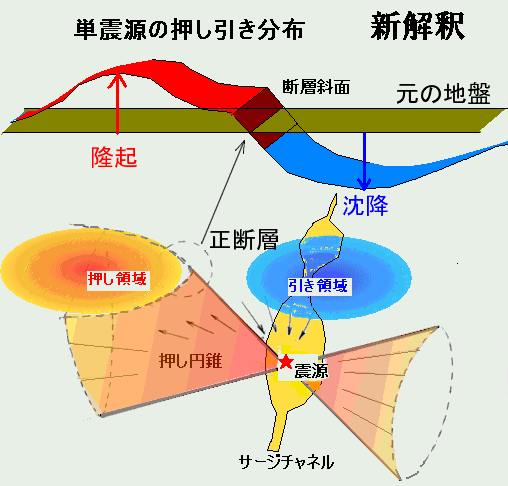 | つまり、震源における大爆発(爆縮)によって、インド側に押し領域が発生し、海底地盤を隆起させたと考えられます。一方タイ側には引き領域が発生し、海底地盤を沈降させたものと考えられます。