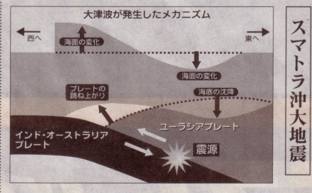 | スマトラ沖地震での津波の発生機構を解説した毎日新聞(2005/1/8)では次のような記事があります。