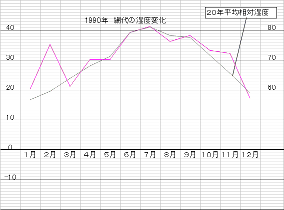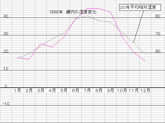 下にある湿度の変化図は過去20年間の平均湿度と、写真撮影場所である網代での値を比較したものです。